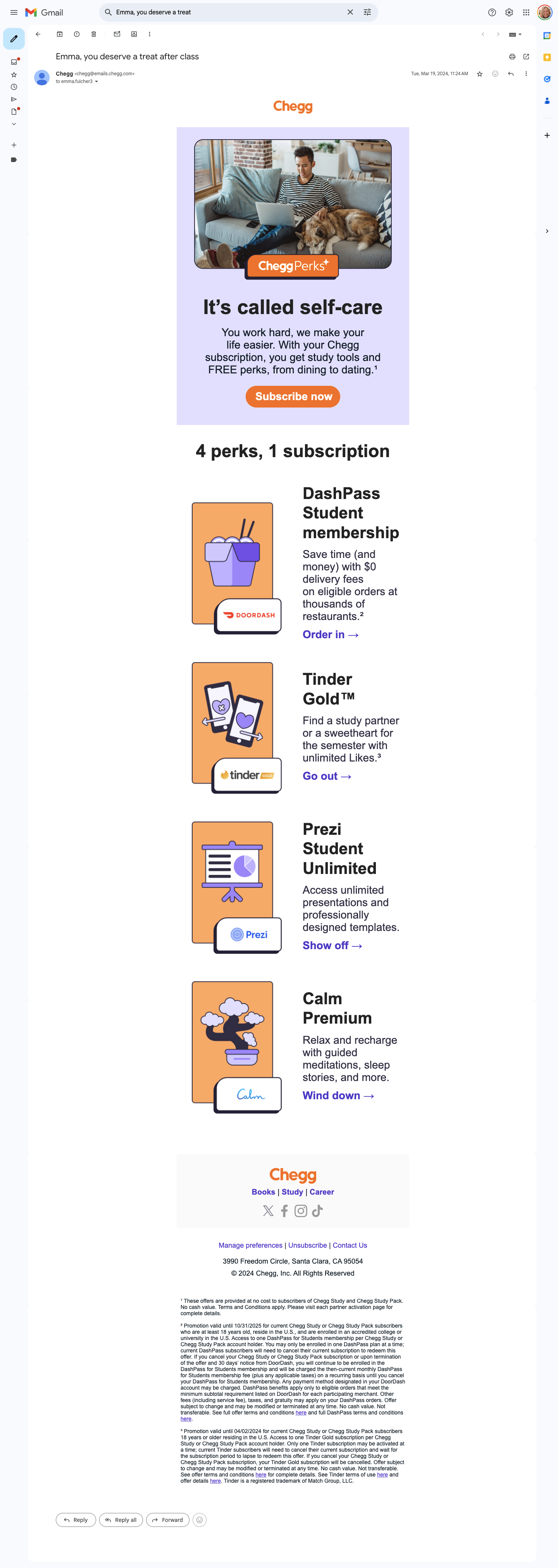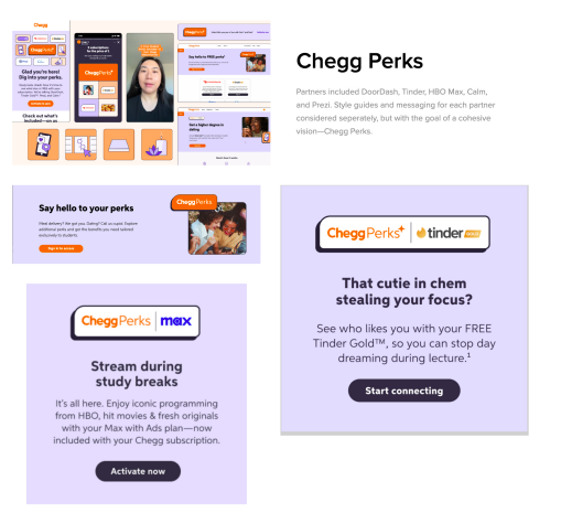Chegg’s Perks emails were more than just announcements—they were a lifestyle invitation. As a lead in the copy function, I drove the editorial vision behind campaigns that celebrated student downtime while aligning with brand tone and product goals.